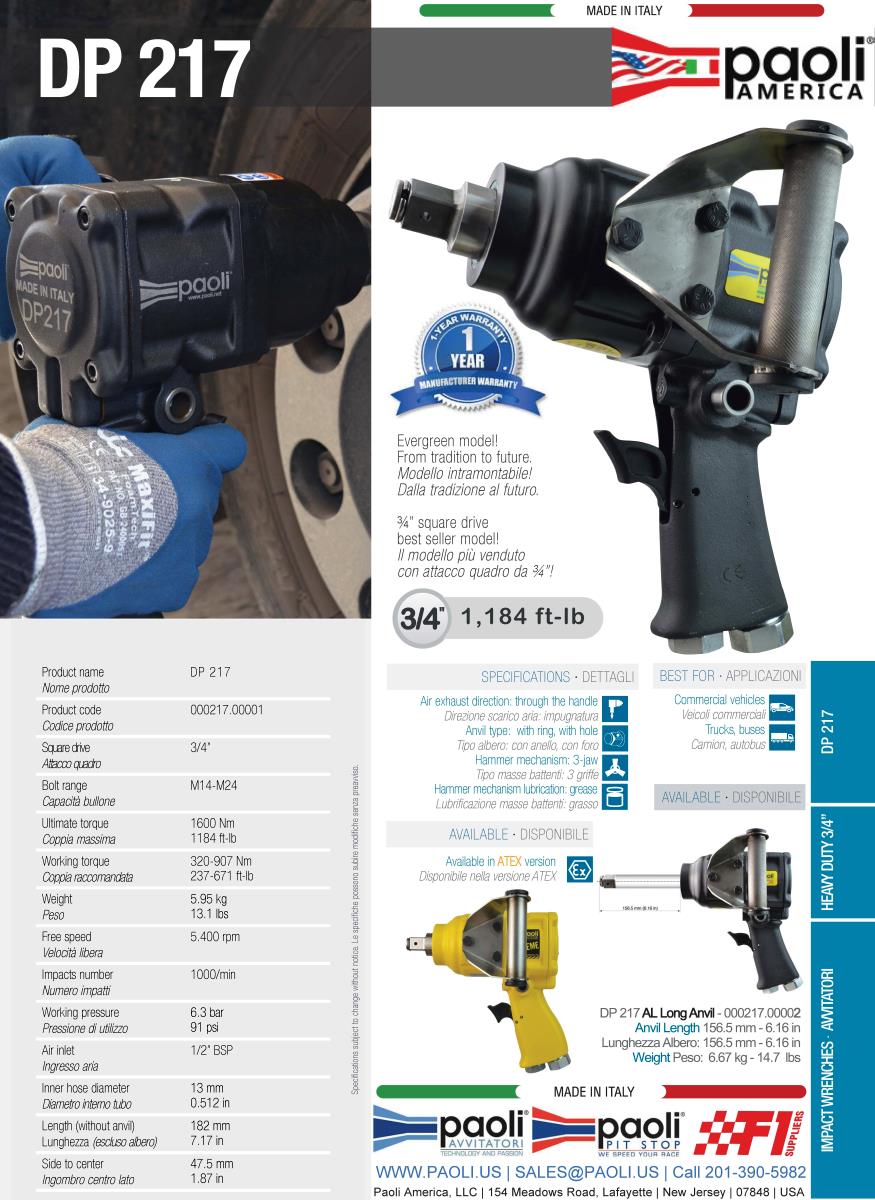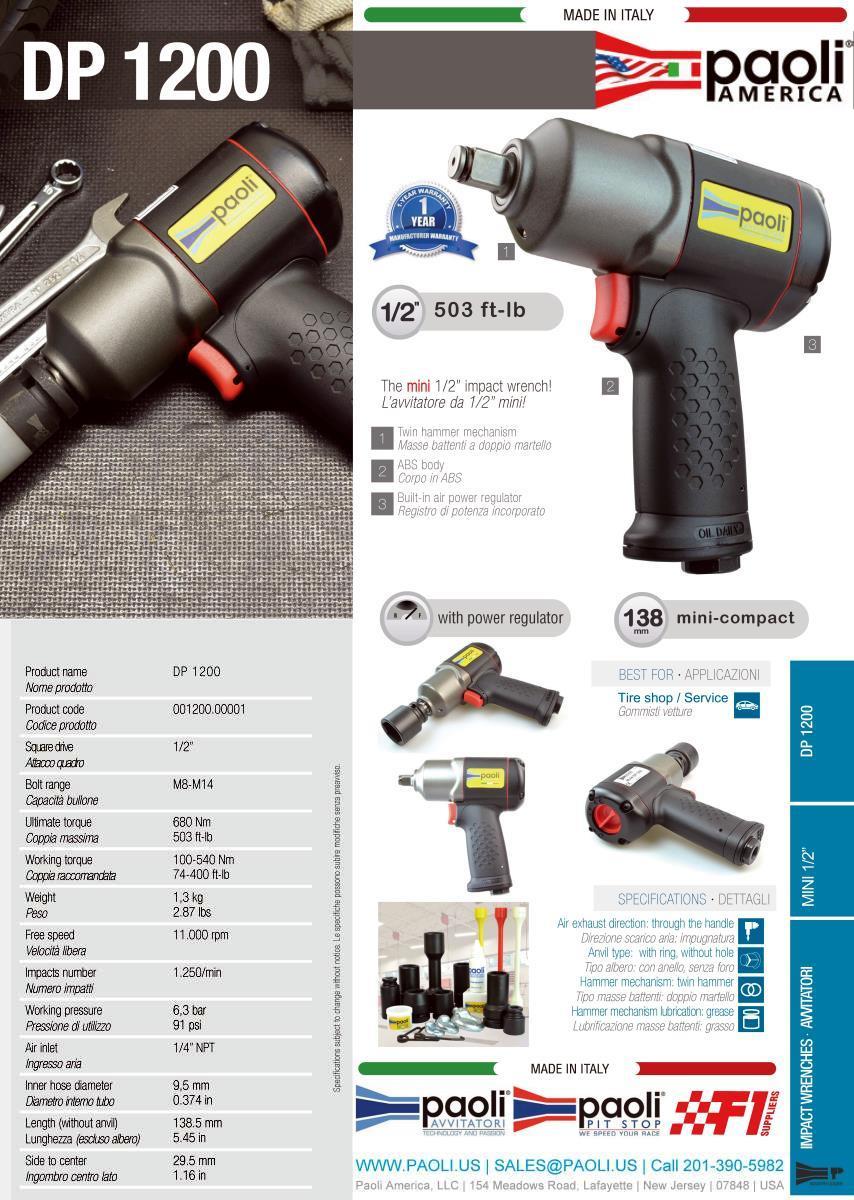 Dino Paoli offers 13 different models of racing wheel guns and 32 automotive and industrial models of impact wrenches. Many models are available with medium and long anvil sub-model. We also have many Nutrunners and ATEX certified Extreme edition impact wrenches. Our exclusive TSA (Torque & Angle Sensor System) TS Lab option is available on many racing and industrial models. When air is not an option or level of noise may be an issue, Dino Paoli offers very quiet and powerful electro-hydraulic systems.  In addition to impact wrenches, we offer a number of Ecological and Suspension system solutions. Our complete line of accessories offers everything you may need from superior quality Dino Paoli regulators to fittings.
